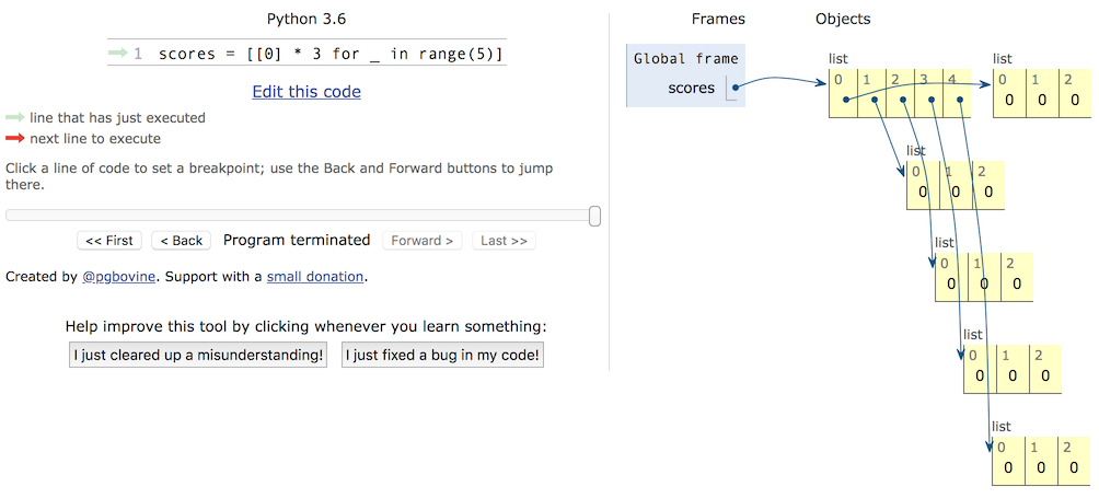 如果对内存的使用不是很理解,可以看看PythonTutor网站上提供的代码可视化执行功能,通过可视化执行,我们可以看到内存是如何分配的,从而避免在使用嵌套列表或者复制对象时可能遇到的坑。