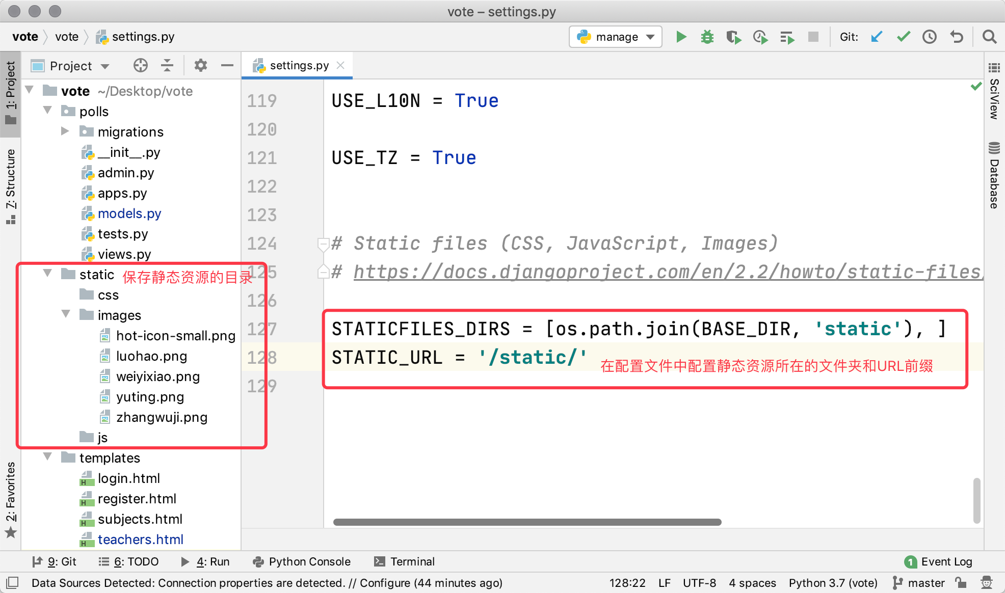 为了能够找到保存静态资源的文件夹,我们还需要修改Django项目的配置文件settings.py,如下所示:
