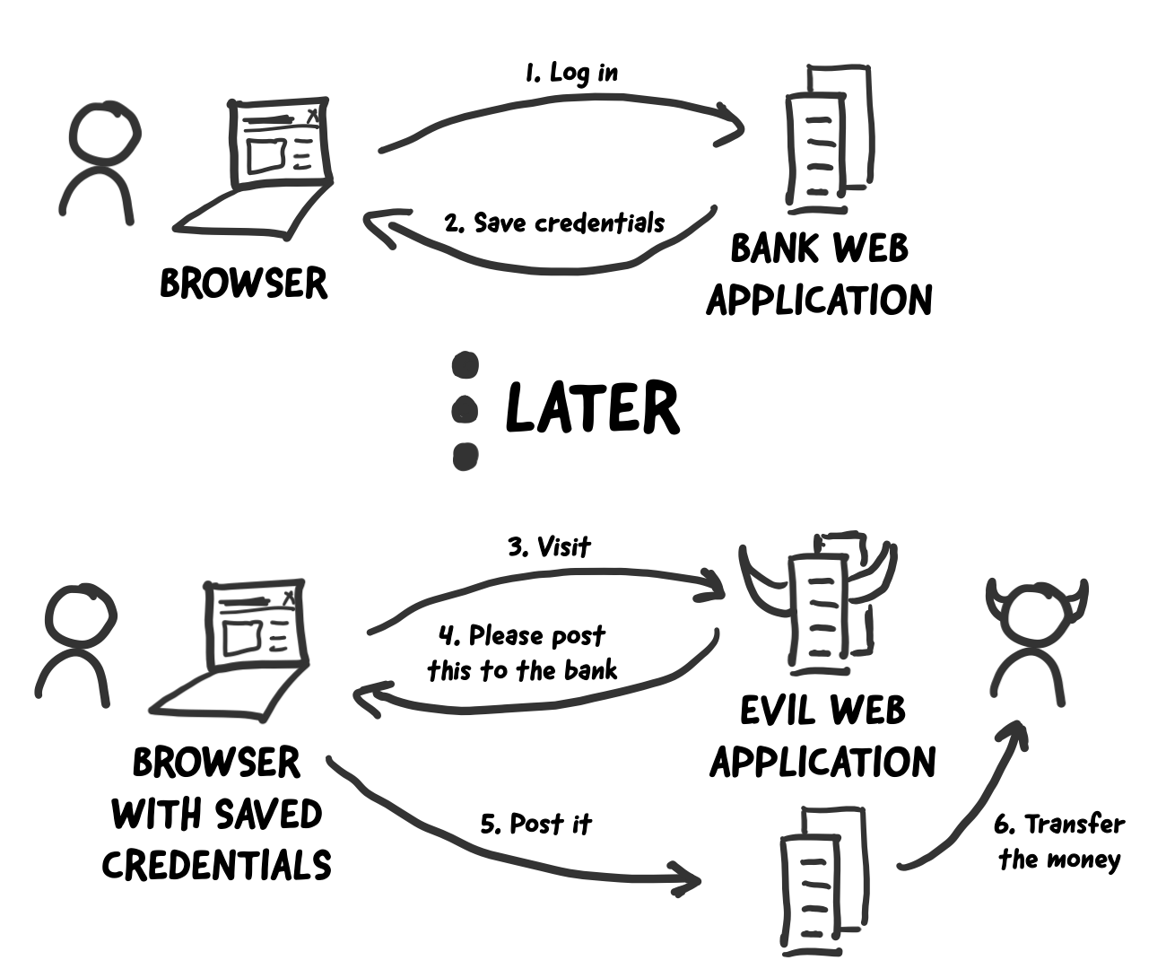 {% csrf_token %}为表单添加一个隐藏域(大家可以在浏览器中显示网页源代码就可以看到这个指令生成的type属性为hidden的input标签),它的作用是在表单中生成一个随机令牌(token)来防范跨站请求伪造(简称为CSRF),这也是Django在提交表单时的硬性要求。如果我们的表单中没有这样的令牌,那么提交表单时,Django框架会产生一个响应状态码为403的响应(禁止访问),除非我们设置了免除CSRF令牌。下图是一个关于CSRF简单生动的例子。