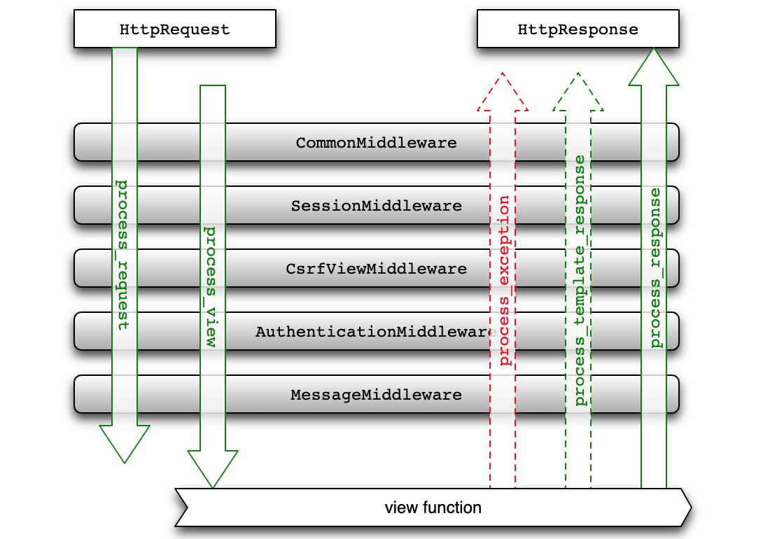 注意上面这个中间件列表中元素的顺序,当收到来自用户的请求时,中间件按照从上到下的顺序依次执行,这行完这些中间件以后,请求才会最终到达视图函数。当然,在这个过程中,用户的请求可以被拦截,就像上面我们自定义的中间件那样,如果用户在没有登录的情况下访问了受保护的资源,中间件会将请求直接重定向到登录页,后面的中间件和视图函数将不再执行。在响应用户请求的过程中,上面的中间件会按照从下到上的顺序依次执行,这样的话我们还可以对响应做进一步的处理。