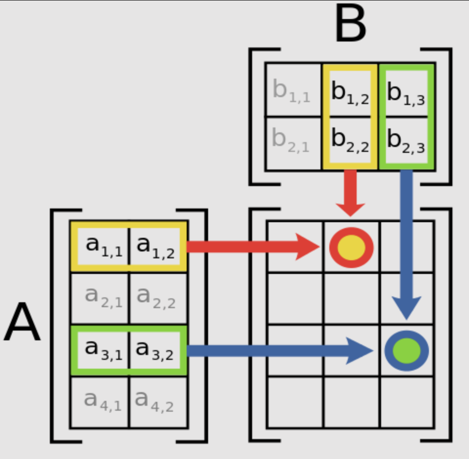 [\mathbf{AB}]{i,j} = A{i,1}B_{1,j} + A_{i,2}B_{2,j} + \cdots + A_{i,n}B_{n,j} = \sum_{r=1}^n A_{i,r}B_{r,j}