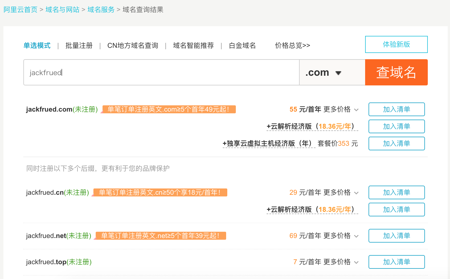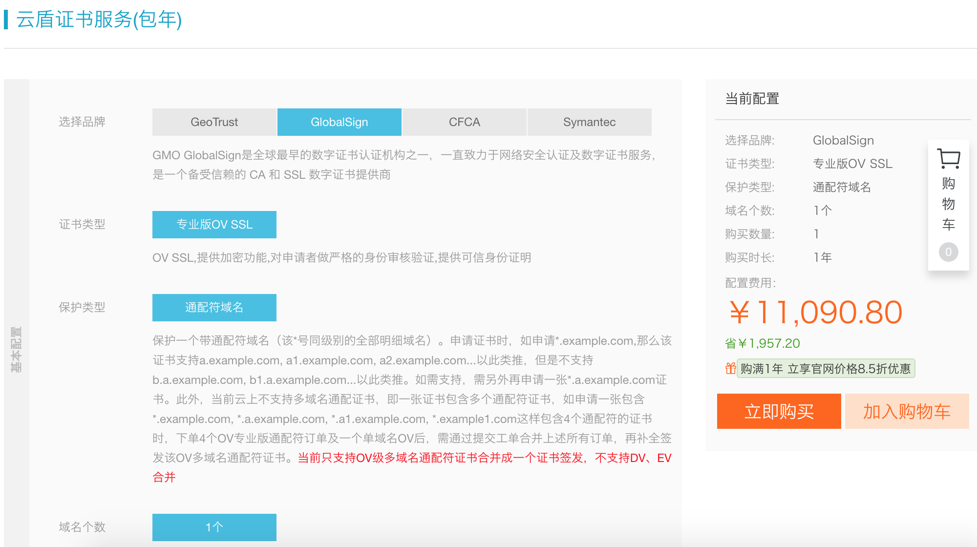 下面以阿里云为例,简单说明如何为项目注册域名、解析域名以及购买权威机构颁发的证书。